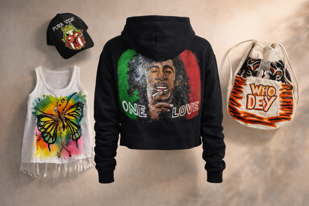 Custom Art Wearable & Custom Art Art that becomes part of your story This is not mass production.Each piece is intentionally created around identity, memory and personal expression Wearable Art Hand-painted jackets, hoodies and tees designed around your vision Pet Art Celebrate your companion with a custom portrait or wearable tribute Portraits Commission a meaningful artwork created from your photo and story Whether you want to wear your story, honor your companion, or preserve a memory — there is a custom path for you Why choose Art Nany? 100% Hand-paintedMade to orderLimited Monthly Availability